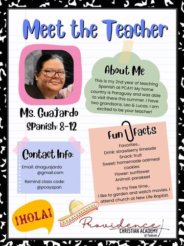It is such a blessing to offer Spanish to our students through the instruction of Mrs. Guajardo! Considering it is her native language, they are immersed in the dialect as they are guided through weekly lessons with her beginning in the 8th grade. We pray that learning Spanish will help prepare them for whatever God calls them to in this world - whether it be college, working, parenting, ministering, or going out into the mission field!