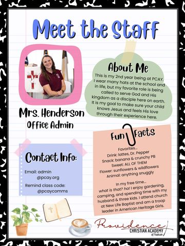 Mrs. Henderson does a little bit of everything for us here at PCAY - from paying the bills, responding to emails, and processing payroll, to leading devotions, subbing, and writing grants. She is thankful to be a part of PCAY, and views it as a ministry opportunity! Support staff keeps things running smoothly, and we are glad to have her here so that our teachers can be with our students and not have to worry about the rest of the day-to-day needs of the school knowing that she has it handled!